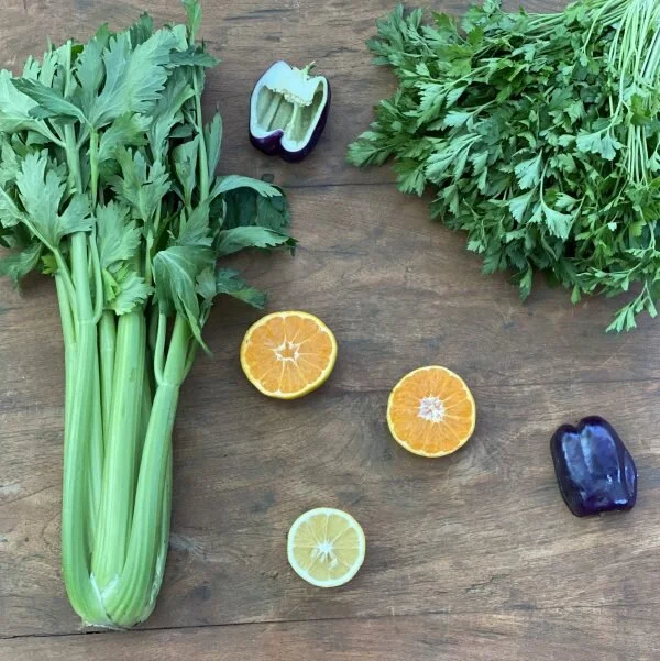 Ingredients: Celery, Parsley, Bell Pepper, Tangerine, Lemon, Olive Oil, Salt and Pepper. You can also add apples to this.