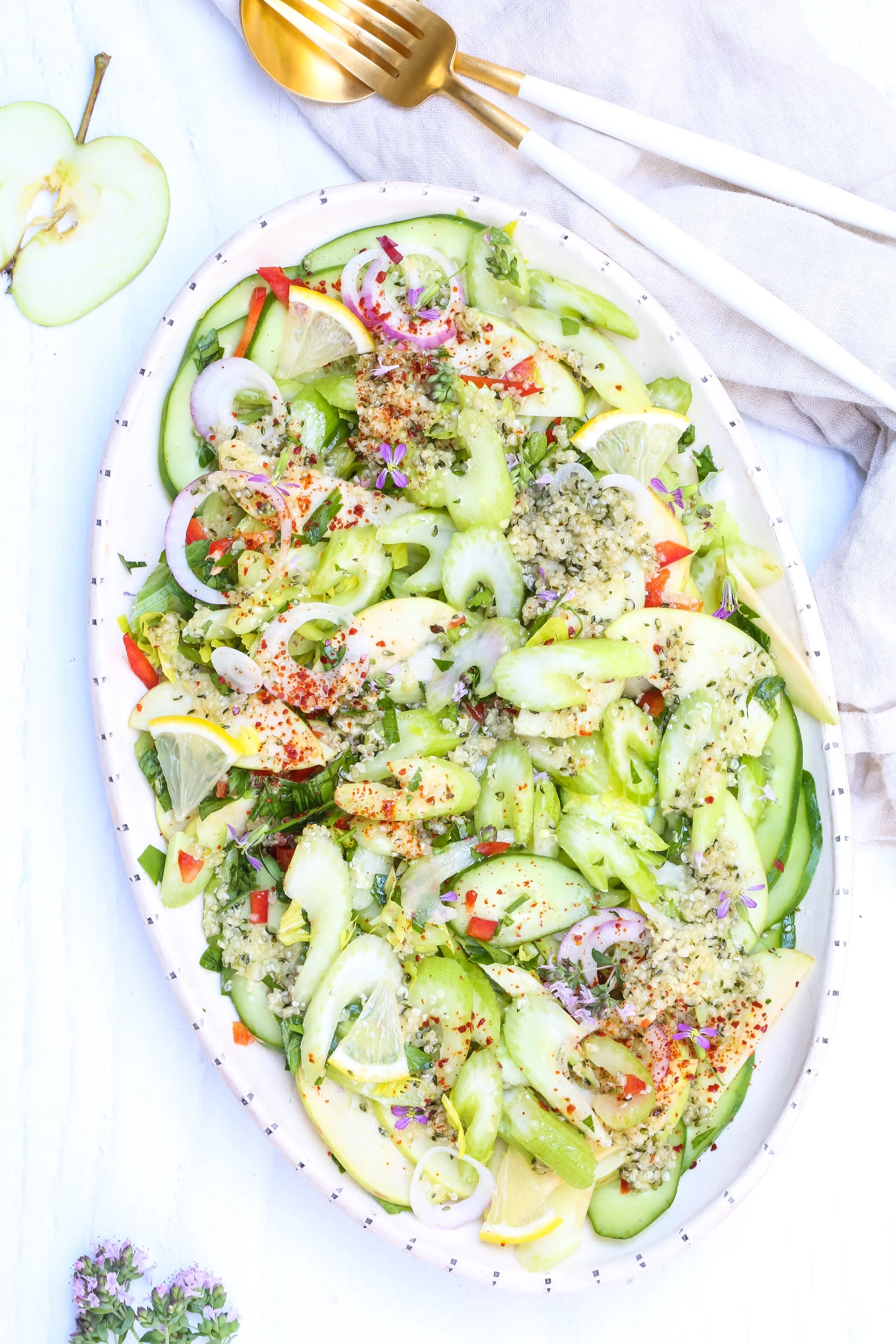 This celery salad has a light lemon dressing with a little bit of plant protein form hemp seeds. It’s refreshing, crunchy, and alkalizing.