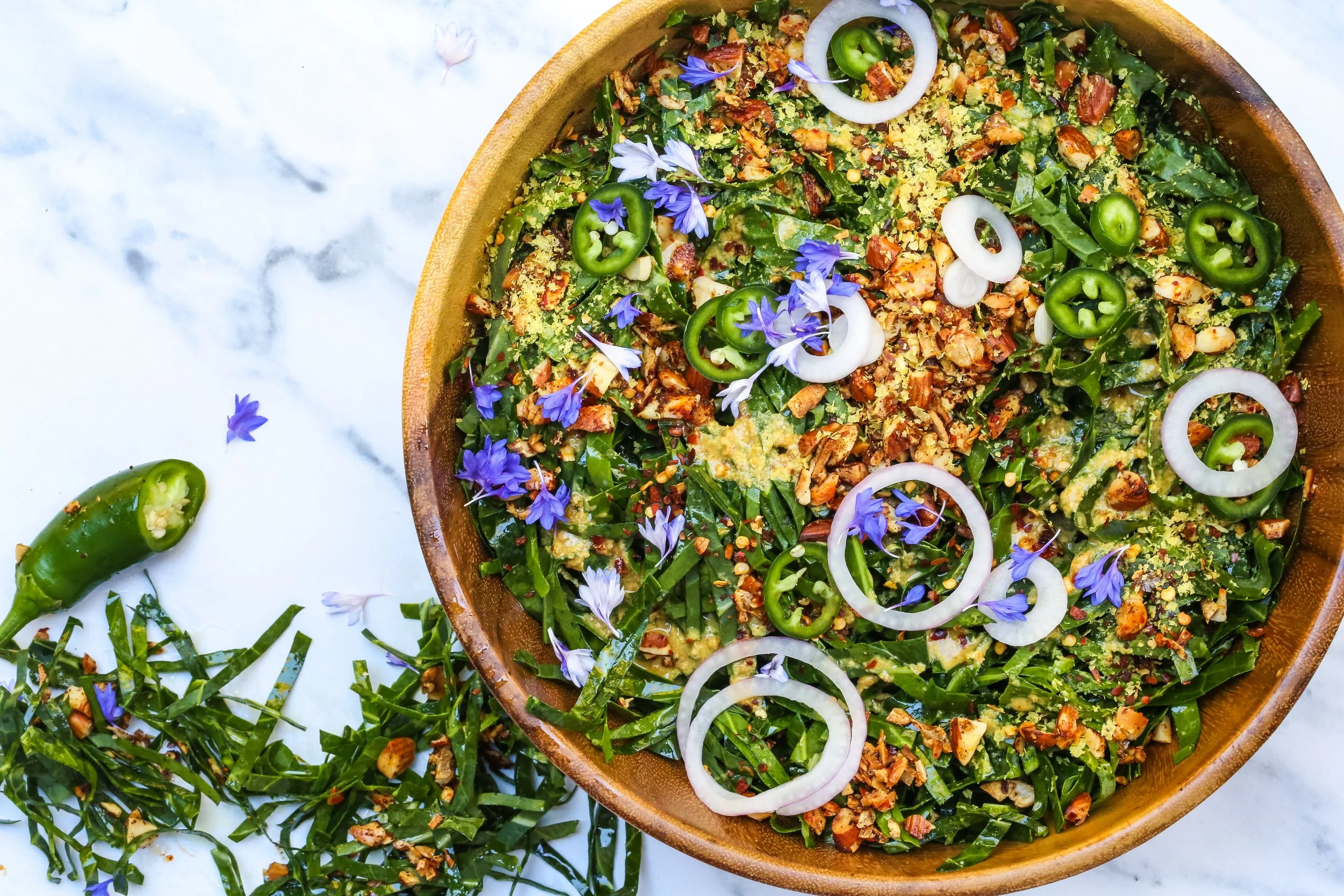 - Whisk the dressing ingredients together and pour it on the leaves. Then add the warm and savory almonds.