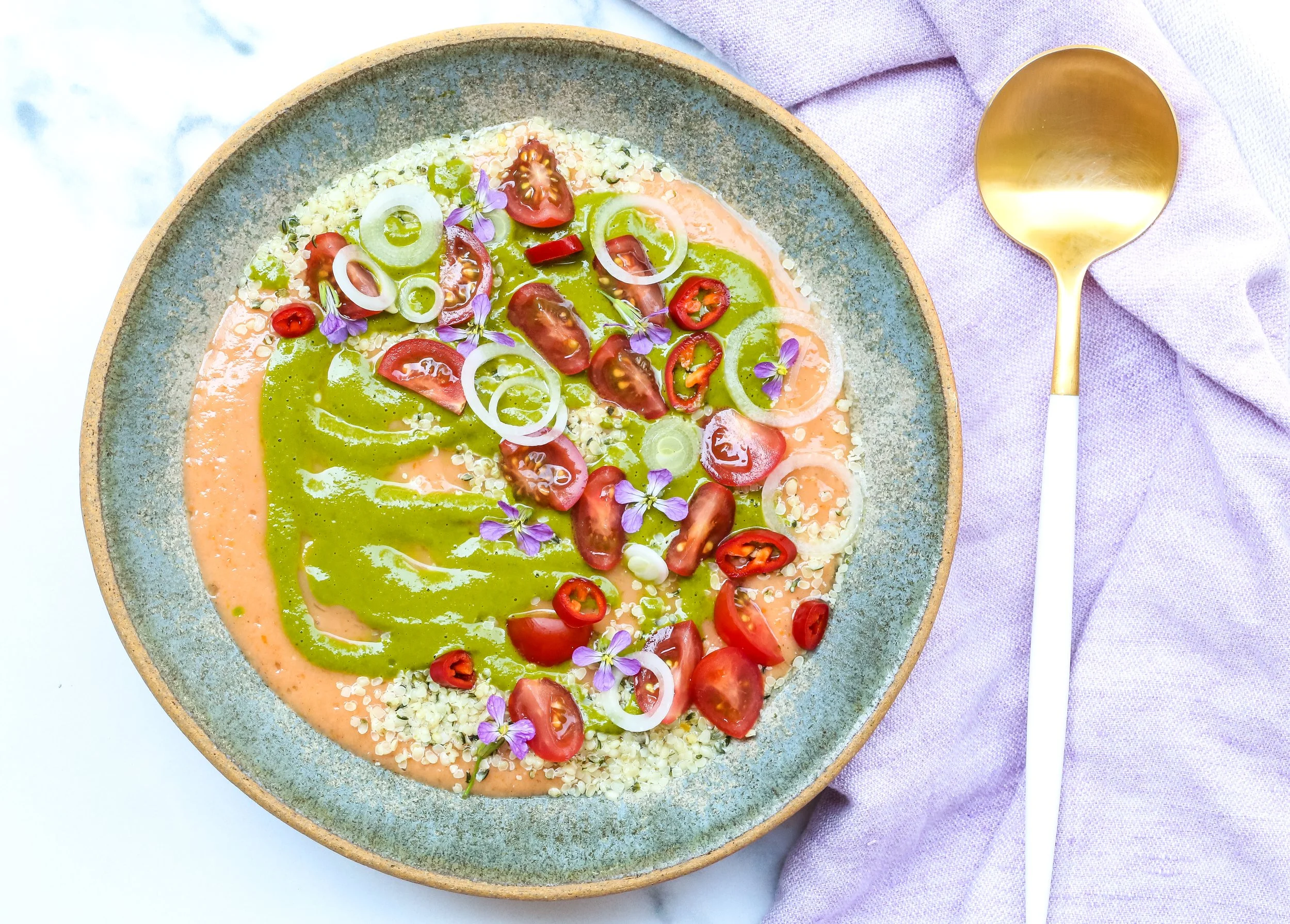 - Put the soup in bowls, add hemp seeds on top, drizzle cilantro sauce on top, and add chopped tomatoes.